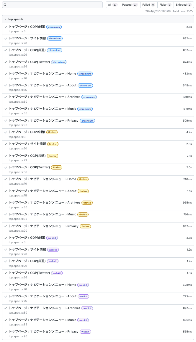 そのため、作ったテストは9つですが結果が27個出ています。テストケース9個 × ブラウザ3つ ということですね。